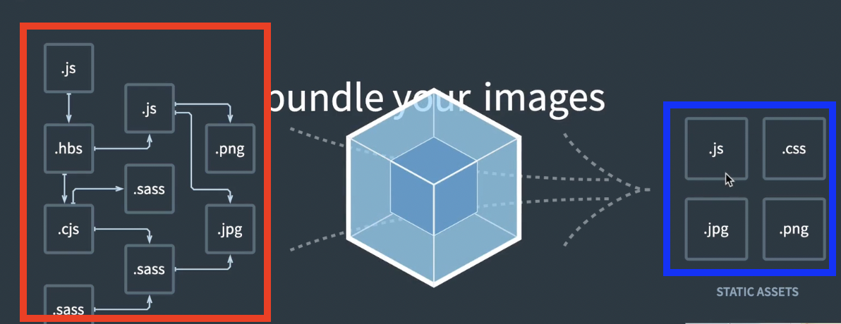 웹팩을 번들러라고 부른다. 왼쪽에 있는 여러 js 파일들을 웹팩을 통해 왼쪽에 있는 파일들(번들)로 만들어낸다. 즉, 여러개의 js 파일을 하나의 번들로 만드는 역할
